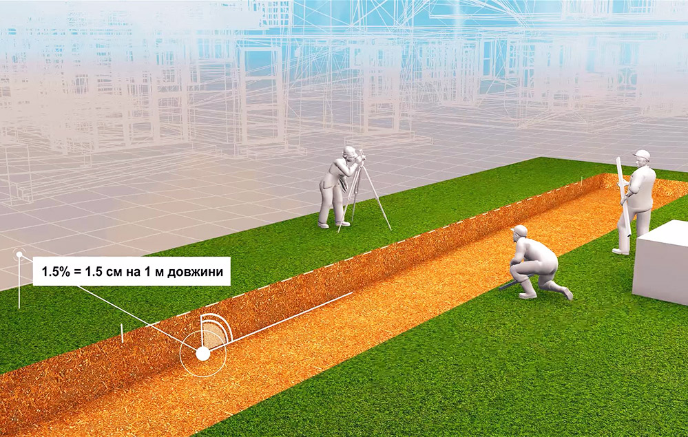 Визначаємо нахил поверхні для стоку атмосферних опадів у напрямі стічних каналів. Для цього використовуємо рівень або нівелір з мірною латою. Нахил поверхні від приміщення до стічних каналів має становити півтора відсотка, що відповідає півтора сантиметру на один метр довжини. Це забезпечить ефективне відведення води від замощеної площі.