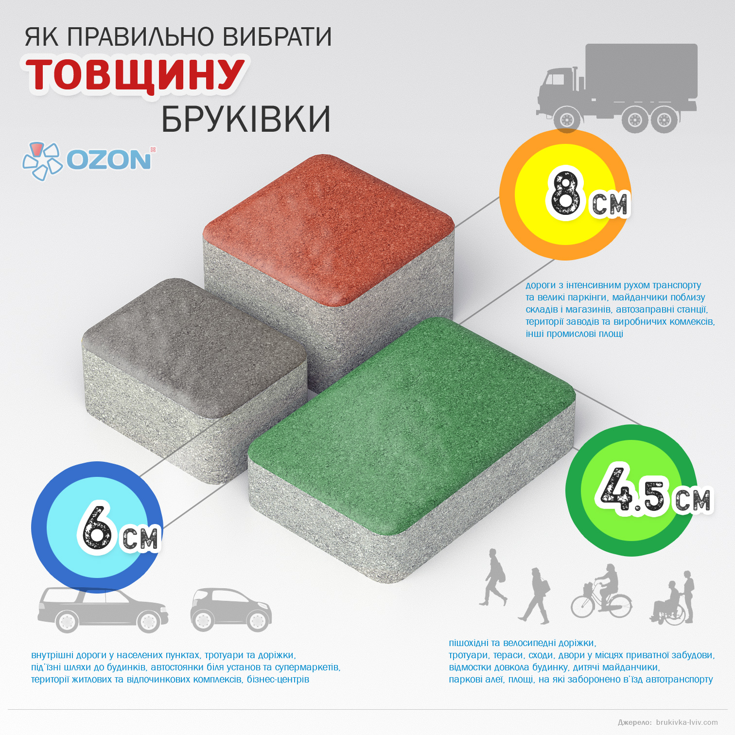 Товщина бруківки не впливає на її естетичні характеристики, проте визначає рівень навантажень, які може витримувати замощення. Існують три стандартні значення товщини бруківки: 4,5 см, 6 см, і 8 см, а також є окремий варіант товщини, яку використовує ТОВ “Озон” – 10 см.