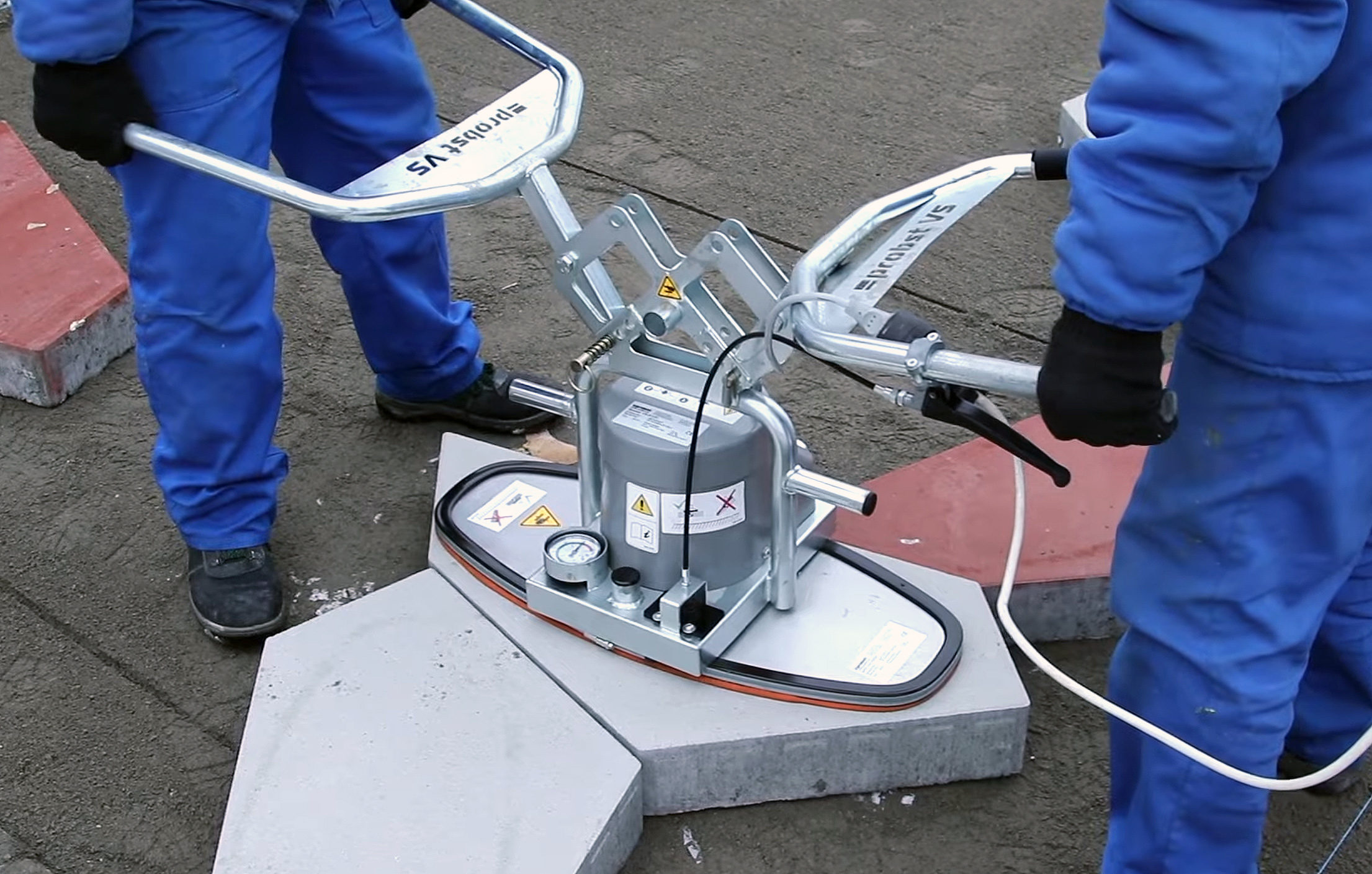 Укладання великоформатної бруківки повинно відбуватися за допомогою спеціальної вакуумної установки. У такому випадку робота здійснюється швидко та просто. Для цього ідеально підходить ручний вакуумний вкладальник Speedy VS-S-230.